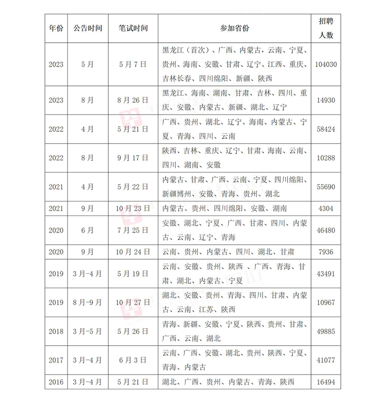 全國多省事業(yè)單位統(tǒng)一考綱、統(tǒng)一時間和統(tǒng)一試卷聯(lián)考從2015年開始,一般一年舉行兩次。上半年一般在5月份舉行,下半年一般在10月份舉行。事業(yè)單位聯(lián)考已經(jīng)成為一種趨勢。事業(yè)單位招考根據(jù)崗位性質(zhì)的不同,在考試中主要分為ABCDE類(即綜合管理類、社會科學專技類、自然科學專技類、中小學教師類、醫(yī)療衛(wèi)生類)。上半年考試是聯(lián)考的重頭戲,每年的招錄人數(shù)和參與省份都比較多。以下是近年的招錄情況: