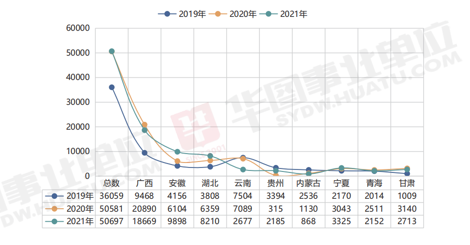從地區(qū)來看, 各地區(qū)的招錄人數(shù)不盡相同, 招錄人數(shù)最多的省份是廣西, 2019 年-2021 年事業(yè)單位聯(lián)考招錄數(shù)據(jù)分析,具體如下圖所示: