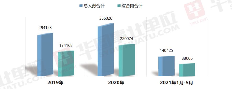 從崗位類型來看, 招錄人數(shù)最多的依然當屬綜合崗,2019 年—2021 年事業(yè)單位招錄人數(shù)如下圖所示: